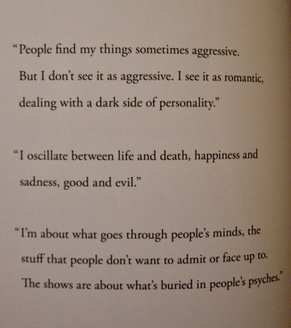 As soon as I got home from the exhibit, I read the book cover to cover. Then, I read it again. It has a special place in my apartment now. Not only does it cover all the pieces in the exhibit, but there are several interviews and statements about McQueen, including a brief biography. Just reading it alone was fascinating enough (of course, I did enjoy looking through the pictures as well).