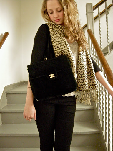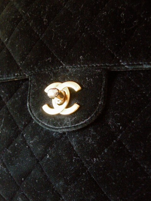 This is Sara. And this is her vintage Chanel velour backpack. I crack up every time I see it- and it is just too fabulous not to show.
