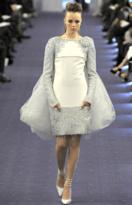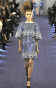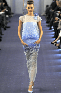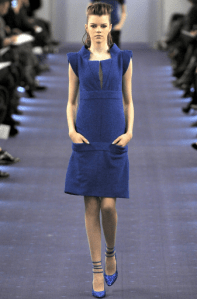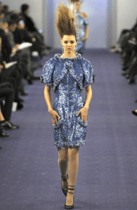 The setting turned out to be perfect for the clothes, which seemed to have been infused with some 1960’s PanAm stewardessness. A little boxy and a little mod, with sculptural necklines and weirdly amazing pockets on dresses with elongated proportions. Well, the shorter, day dresses were like that. The longer ones, and the more ornate cocktail dresses were quintessential Chanel, all in shades of blue, 150, to be exact. (I wonder what this means for the next nail colors? Will they be blue?) Here there was more beading, more shine, more sheer, more glam, and more pockets. The glamour of Haute Couture was there will full force, and still with innovative necklines and interesting shapes. The jewels, however, seem to have fallen from the dresses and onto the models legs. A product of gravity, perhaps? How cheeky.