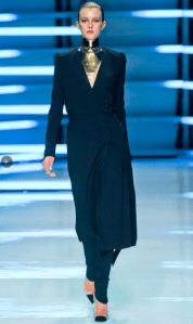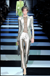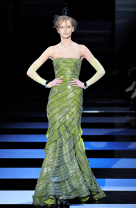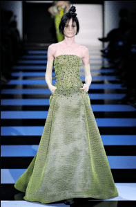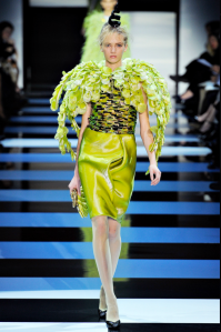 If anyone has embraced the neon/acid/chartreuse green thing more than Armani did with this couture collection, please let me know. Not that it’s bad, I actually am loving this color. There were a lot of suits, both with skits, egg-shaped, and trousers, slim, and of course the dresses everyone loves to wear on the red carpet (how fortunate that the Oscar nominations were just released, right before the show, as it seems from Jessica Chastain’s phone call.) Mr. Armani’s inspiration was ‘metamorphosis’- (think Kafka) which seems appropriate given all the iridescents and greens. More confusing were the spirally head things… His show also went through a process, a metamorphosis so to speak, of it’s own- from shiny suits to some bug looking creation to some reptiles showing up to feed on the bugs (that part is made up, by me.) Interesting clothing, though a little hit-and-miss, and some nice Oscar dresses, don’t you think, Jessica?