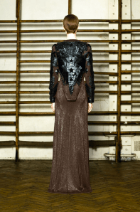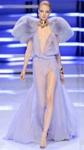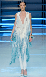 A ‘younger’ couturier (he debuted in 2009), his collection was quite the mix of crisp tailoring and draping. A little Calvin Klein, a little Halston, a little fur, fringe, and shine. While not totally cohesive, his clothing was beautiful and clean, and I do hope someone decides to take a risk on the red carpet and wear that shiny sequined-y tux like suit. Or, at the very least, one of those gold collars, which cover up the décolletage quite nicely (how excellent for preventing sunburns).
