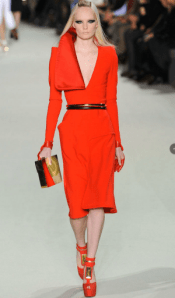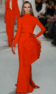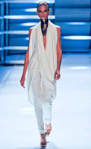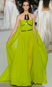 While everyone else was focusing on how the could all do green, Stephane Rolland was focused on red, white, black, and..oh, and green, he did green too. An interesting choice in a collection with red, but it somehow worked, through sculptural dresses with sculptural sculptures coming off of them. There was little embellishment or bedazzling, refreshing, for couture, save for the case of a white dress with orange and red flames coming up from the bottom- no one can say the sparkle wasn’t beautiful in that dress.