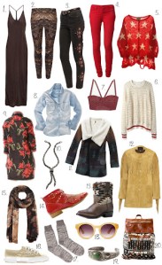 Footwear for this occasion includes Billy Short Boots (13)Ankle Boot with Studded Toe (14), and Superga’s 2750 Metallic Sneakers (16), because even hippies need a little metallic in their lives. Moccasins are also acceptable. You might also see birkenstocks, which are not acceptable, ever, but hippies will be hippies. Ski-like socks-Marled Boot Sock (17)– are fully acceptable, especially if casually poking out of one’s boots. Keep your neck either fashionable or warm with Dannijo’s Brielle Necklace (10) and AllSaints Blossom Decay Scarf (15). Your wrists will probably be cold anyways, so go ahead and jewel those up with an awesome Vintage Marana Cuff (19), or any other vintage or wild-west-inspired thing. The Hepcat Shades (18) might not be vintage or wild west, but they are still cool. And, of course, one needs a backpack at these sort of festival like things, so here you go-Tribal Leather Flap Backpack (20).