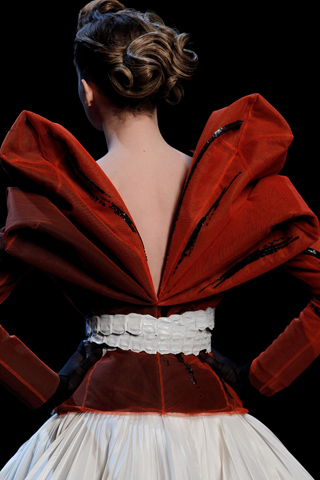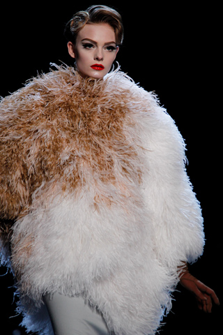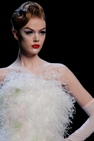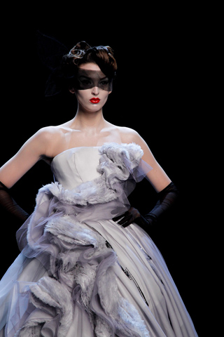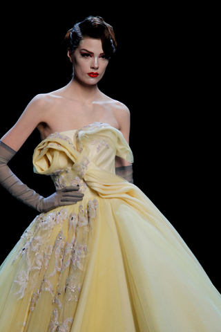 And it’s a good thing they did (well, it’s not like there was much of a choice, as no replacement for Galliano has been found thus far). Gaytten brought Dior Couture back to it’s roots with a bang, or in this case, an x-rated bang. The full skirts and fitted tops were back. The crazy prints, extra fabric, and geometric head things were gone, and in their place stood the classic silhouettes and ladylike beauty of the Dior we all know and love, but with a saucy twist. Sheer fabrics gave a glimpse inside the clothes, showing their machinery (and the models machinery as well). Past the sheerness though, were beautiful, classic clothes brought up to date a bit. Gaytten’s collection had the feeling of a designer who has just shown his first show at a new house, when he works more cautiously and takes less risks than he might in the future. A promising ‘start’, he left the fashion world wondering just what’s going to happen next.