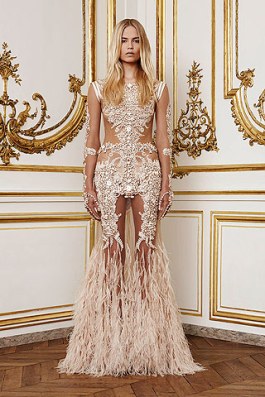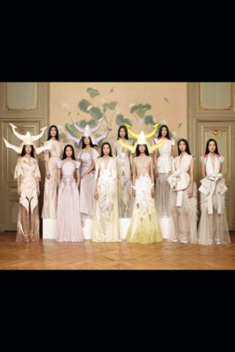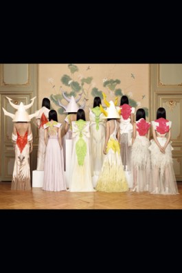 Oh, don’t we just all love Givenchy? Riccardo Tisci can do no wrong, really, especially in his couture, which always has some of the most exquisite pieces from all the couture shows. This season, he went a bit darker, much darker, in fact. But the non-whiteness of the clothes didn’t make them any less beautiful. I fact, it was sort of refreshing to see him do something so dark for Couture. His inspiration came from two 1920’s films, making it clear where the art-deconess of it all came from. Though neither films were related to bugs, his models, with their giant nose adornments, almost looked like them. Maybe he and Giorgio conferenced on colors inspirations. A bit should be said about the crocodile (seriously, everyone is lovin this shit right now) which was, for a long and clingy dress, cut into the individual scales, numbered, belched, dyed, and resewn one by one onto a tulle body stocking. While Karl was busy erecting his plane with his free 350 hours, Tisci was busy making one of the most beautiful dresses he’s ever made (until next season, at least). I’ll be honest and say I don’t understand the basketballs, but maybe that came from one of his movies. Let’s all run and watch them now, then maybe we can understand too.