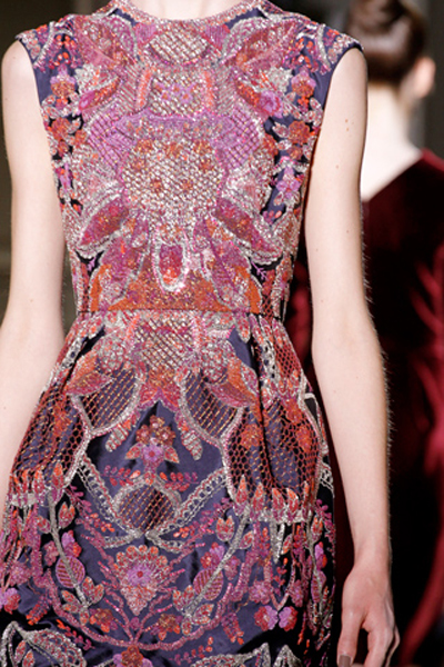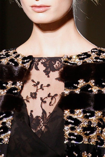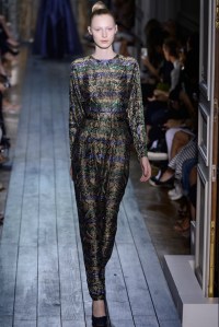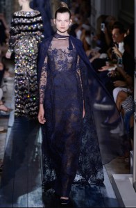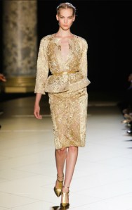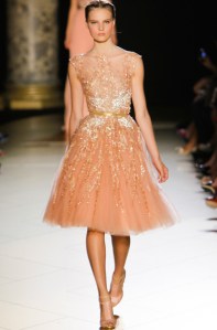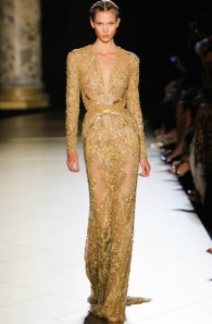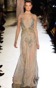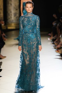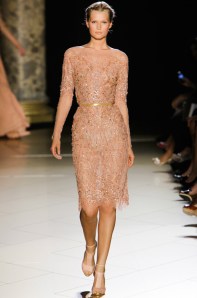 Elie Saab branched out this season- instead of just beautiful beaded gowns with a variety of necklines, sleevs lengths, etc. (which, don’t get me wrong, I love) he had pieces without embellishent, gold foil, and dresses with multiple colors on them (ok, so maybe that was just a few nude gowns with a bit of blueish teal, but hey) There was still a distinct color pallete-order, as there always in, but instead of just pastels, the show opened with balck, segwayed into nude, peach, robins-egg then teal blue, darker nude, and finally gold. There were a few turtleeck dresses, which I loved, for not only do they conceal an unsightly neck, but they look so chic!